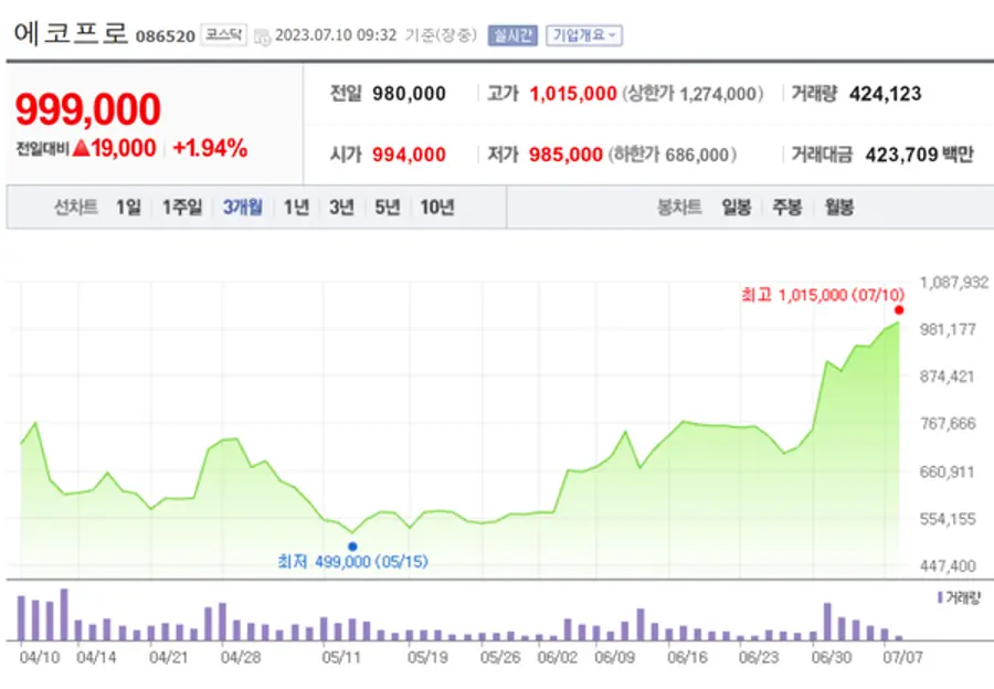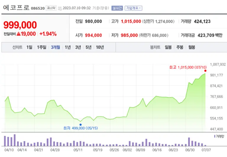 에코프로는 10일 오전 9시22분 현재 전일보다 2.24% 상승한 1만200원에 거래되고 있다. 한 때 101만5000원까지 올랐다. 7일 하루 쉬고 재차 사상최고가 도전에 나서 100만원도 뚫었다.