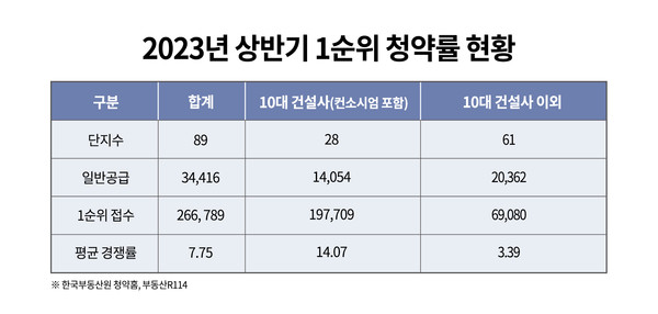 부동산R114가 상반기 아파트 청약결과를 분석한 자료에 다르면 도급순위 상위 10대 건설사들이 시공한 브랜드 아파트의 1순위 평균 경쟁율은 14.07대 1로 나타났다. 10대 건설사 이하의 건설사가 시공한 아파트 1순위 경쟁율은 3.39대 1로 조사대 10대 건설사 아파트가 4.1배 높게 나타났다.