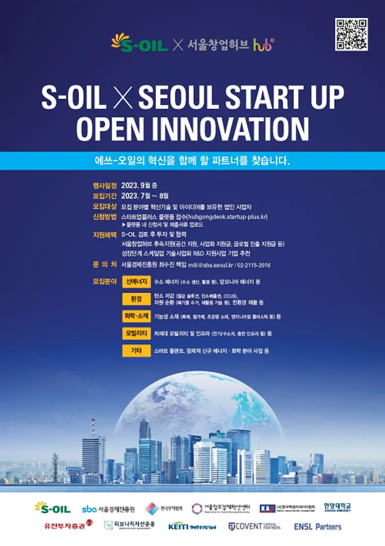 S-OIL은 서울시의 중소기업·스타트업 지원기관인 서울경제진흥원이 운영하는 서울창업허브와 공동으로 스타트업 협업 프로그램(2023 S-OIL X Seoul Startup Open Innovation)에 참여할 혁신기술 스타트업을 선발한다.