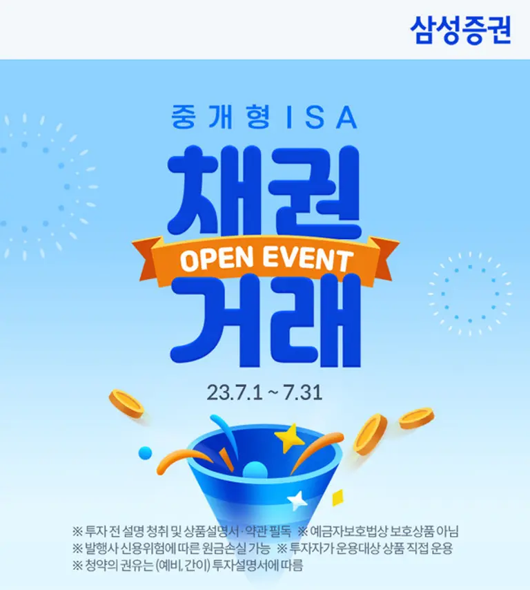 삼성증권(사장 장석훈)은 중개형ISA 계좌에서 온라인으로 국내 채권을 10만원 이상 첫 거래한 고객 등을 대상으로 다양한 이벤트를 이달 말까지 진행한다고 18일 밝혔다.