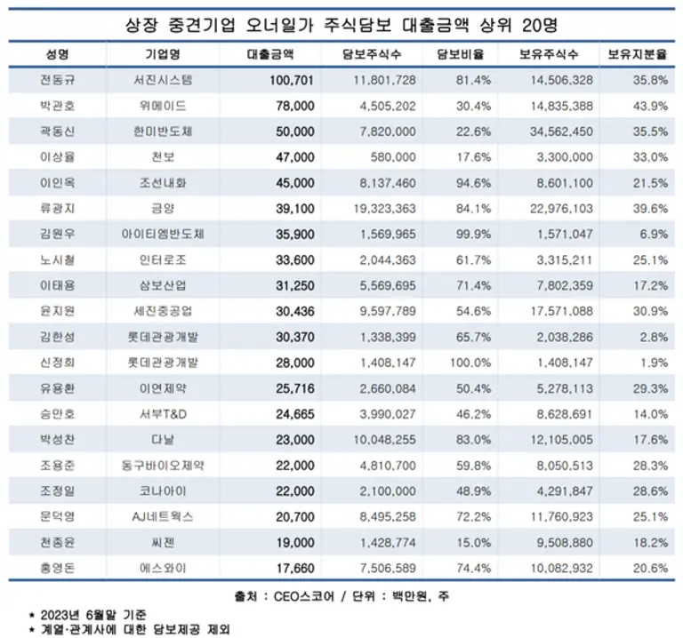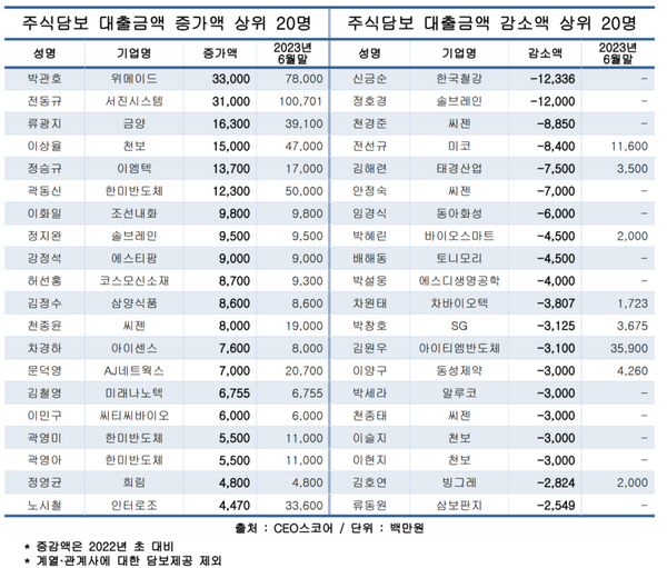 규모에서는 전동규 서진시스템 대표이사 주식담보대출 규모가 1007억원으로 가장 컸고, 증가 폭에서는 박관호 위메이드 이사회 의장이 1년 6개월 사이 70% 이상 늘면서 1위를 기록했다.
