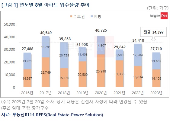 부동산R114는 8월 전국 아파트 입주 예정물량은 총 2만 7710가구(임대 포함)로 집계됐다고 24일 밝혔다. 8월 기준으로 2016년 2만 7488가구 입주물량 이후 최저 수준이다. 2016년부터 지난해까지 7년간 8월 평균 입주물량 3만 4397가구보다도 약 20% 줄어든 수치다.