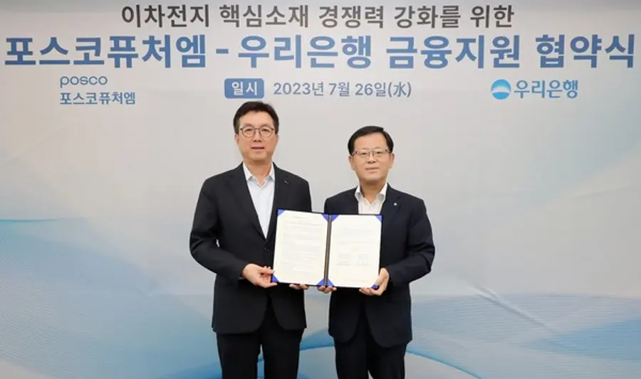 우리은행(은행장 조병규)은 포스코퓨처엠과 “이차전지 핵심소재 경쟁력 강화를 위한 금융지원 업무협약”을 체결했다고 26일 밝혔다.