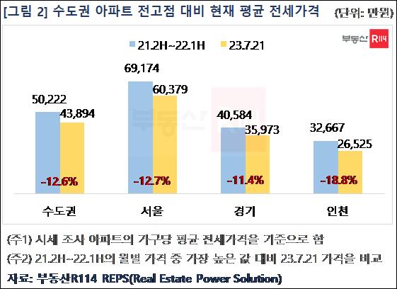 반등 지역도 속속 등장하고 있지만 전고점 가격 수준을 회복하려면 시간이 더 필요한 상황이다. 부동산R114에 따르면 7월 21일 현재 수도권 아파트 가구당 평균 전세가격은 4억 3894만원으로 2021년 하반기부터 2022년 상반기 사이에 형성됐던 전고점 가격(5억222만원)에는 미치지 못하고 있다.