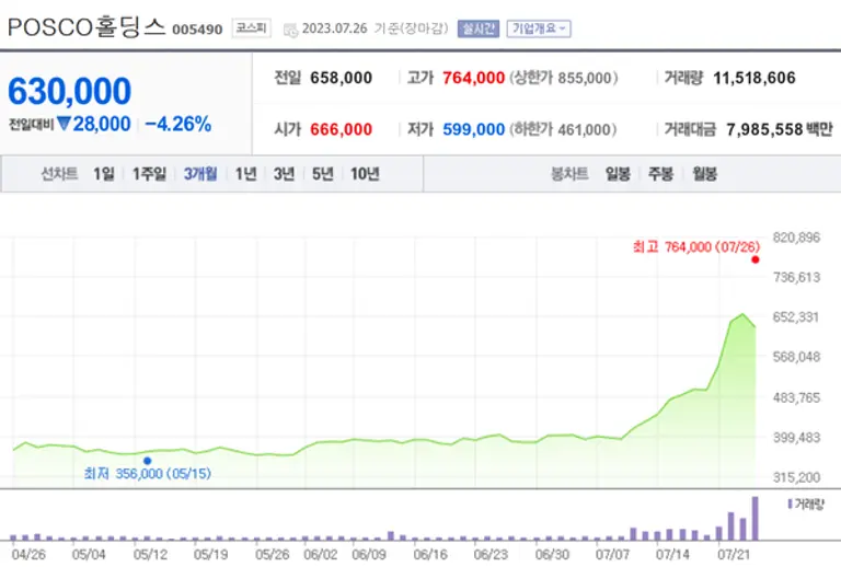 26일 주식시장에서 2차전지 주들이 발작에 가까운 주가 흐름을 보인 가운데 포스코홀딩스 주가 흐름에 주목해야 한다는 의견이 나왔다.