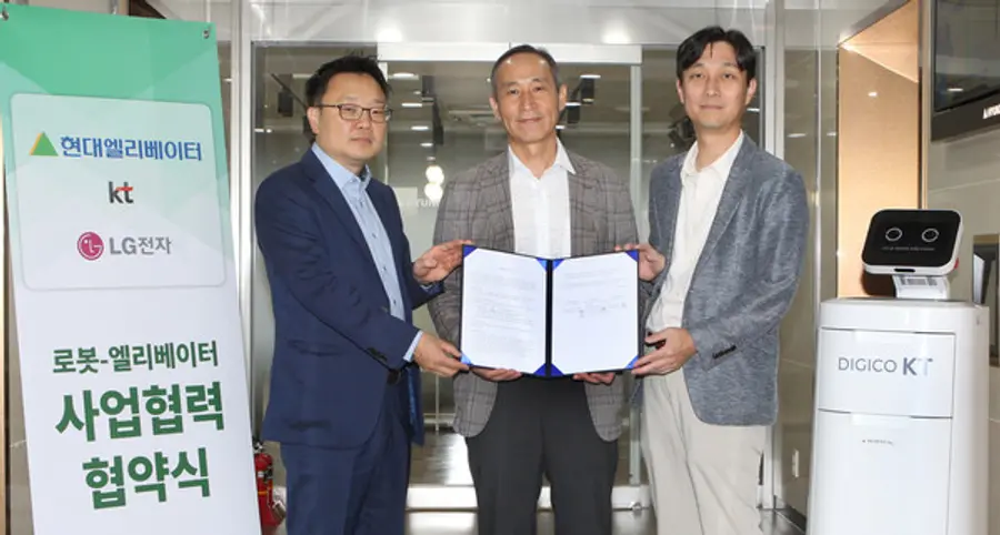 현대엘리베이터가 KT, LG전자와 함께 로봇·엘리베이터 연계 사업과 로봇산업 활성화를 위한 3자간 MOU(양해각서)를 27일 체결했다.
