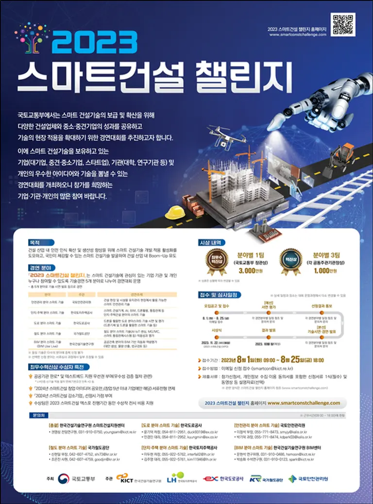 국토교통부는 우수한 스마트건설 기술을 발굴하고 활성화하기 위해 ‘2023 스마트건설 챌린지’를 개최한다고 1일 밝혔다.