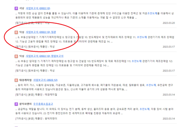이제 '본문내용' 검색을 이용해 '초전도체'를 검색해보자. 검색 결과에서 기업들이 제출한 서류 가운데 '초전도체' 단어가 들어간 검색값을 아래에 쭉 나열해주고 있다.