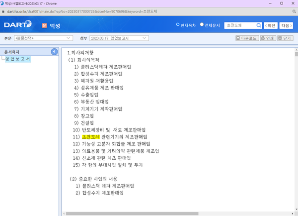 덕성의 2022년 사업보고서를 클릭해보면 회사의 정관상 사업 목적에 '초전도체 관련기기의 제조판매업'이 포함돼 있는 것을 확인할 수 있다.