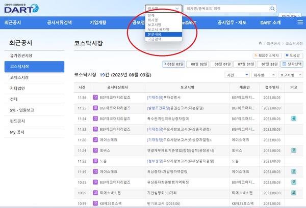 주식투자자라면 누구나 알고 있는 금융감독원 전자공시시스템 다트(DART) 창을 열어보자.