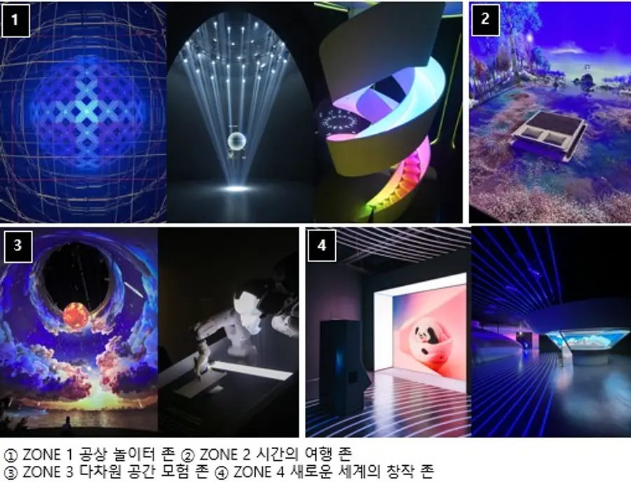 총 130K 해상도의 빔 프로젝터, 총 2천 2백만 개의 LED로 구현되는 빛과 영상, 아티스트, 디자이너, 건축가, AI 엔지니어, 뮤지션 등 각 분야를 대표하는 최고 작가들과의 협업, 빛·소리·영상·음악·향기 등의 감각을 재현한 미디어 아트, 휴머노이드 로봇을 활용한 맞춤형 콘텐츠 등 여타 다른 전시들과 차별화했다.