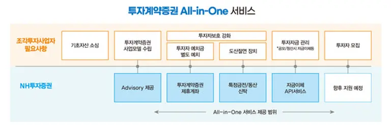 NH투자증권은 토큰증권(STO) 기반의 조각투자 사업자 지원을 위한 ‘투자계약증권 올인원(All-in-One) 서비스’를 출시했다고 7일 밝혔다.