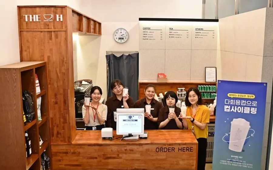 한미그룹 지주회사 한미사이언스와 한미약품이 서울 송파구 본사 인근에서 운영 중인 사내 카페 ‘The H’의 일회용컵 사용을 획기적으로 줄이기 위해 다회용컵을 도입했다.