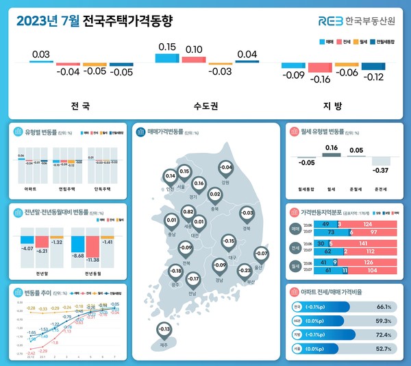 한국부동산원이 16일 발표한 '7월 전국주택가격동향조사'에 따르면 전국 주택종합 매매가격은0.03%로 전달 -0.05% 하락에서 상승전환했다. 수도권(0.03%→0.15%)과 서울(0.05%→0.15%)이 상승폭이 확돼되고 지방(-0.13%→-0.09%)은 하락폭이 축소된 결과다.
