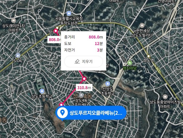 반면 상도 푸르지오 클라베뉴는 반경 700m 내에 지하철 7호선 장승배기역이 위치해 있다는 점을 내세우지만 역세권 아파트라고 부르기에는 다소 민망하다. 장승배기역까지는 언덕길을 넘어야 하고 도보로 10분 이상 소요되기 때문이다. 또 인근의 주 간선도로인 장승배기로와 양녕로로 진입하기까지는 이면도로를 거쳐야해 자동차 진출입도 불편을 겪을 수 있다.