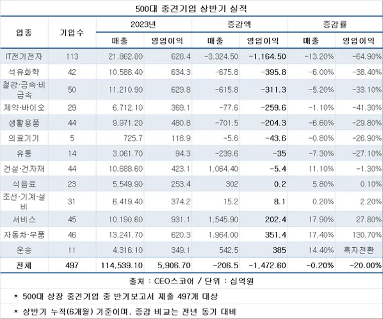 업종별로 보면, 반도체 한파 등으로 인해 IT전기전자 업종의 영업이익 감소폭이 가장 컸다. 올 상반기 IT전기전자 업종의 영업이익은 6284억원으로, 전년 동기 1조7929억원에 비해 64.9%(1조1645억원)나 급감했다. 반도체 업황 부진이 장기화되면서 삼성전자, SK하이닉스 등 주요 반도체 대기업들이 큰 타격을 받았고, 그 충격파가 중견기업들 실적에도 고스란히 반영되었다.