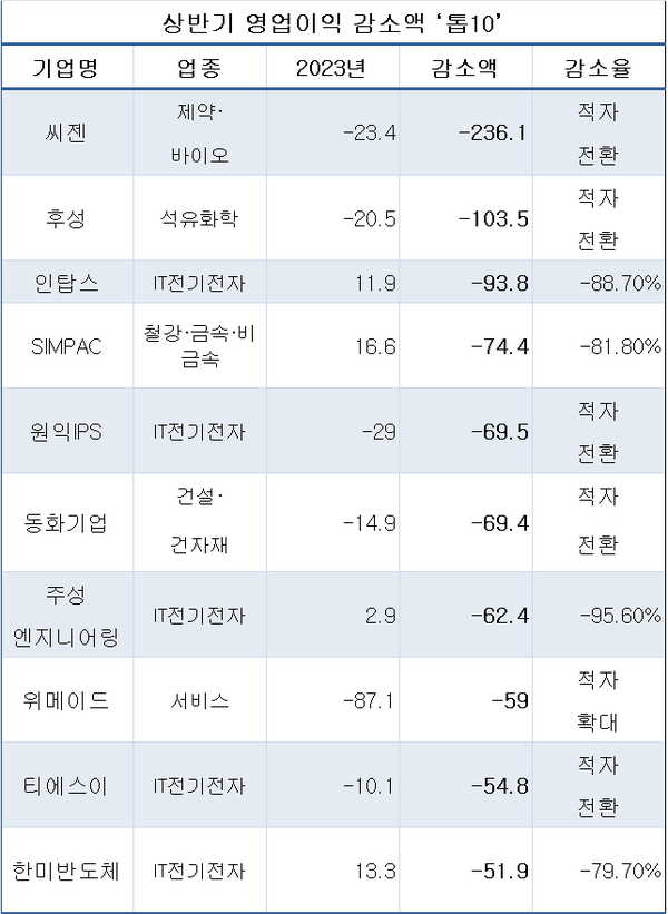 불소화합물 제조사인 후성도 지난해 상반기 830억원의 영업 흑자에서 올 상반기 205억원 적자로 돌아섰다. 이어 인탑스(-938억원·88.7%↓), 심팩(-744억원·81.8%↓), 원익IPS(-695억원·적자전환), 동화기업(-694억원·적자전환), 주성엔지니어링(-624억원·95.6%↓), 위메이드(-590억원·적자확대), 티에스이(-548억원·적자전환), 한미반도체(-519억원·79.7%↓) 등도 영업이익이 큰 폭으로 줄었다.