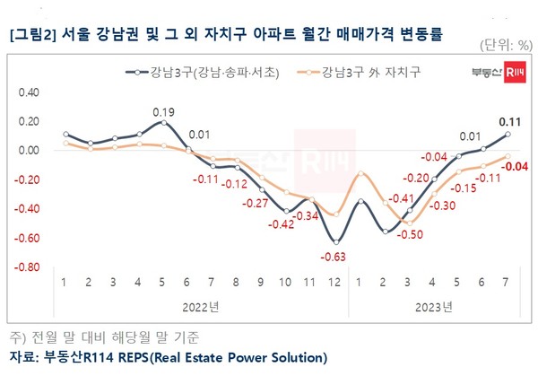 작년 부동산 침체기에 하락 속도가 가팔랐던 강남3구는 작년 12월 한달 새 0.63%까지 빠진 이후 올해 3월부터 낙폭이 점차 좁혀지더니 6월 이후 2개월 연속 상승세를 이어갔다. 강남3구(강남·송파·서초)도 지난달보다 가격 상승폭이 커지며 아파트값 반등을 견인했다.