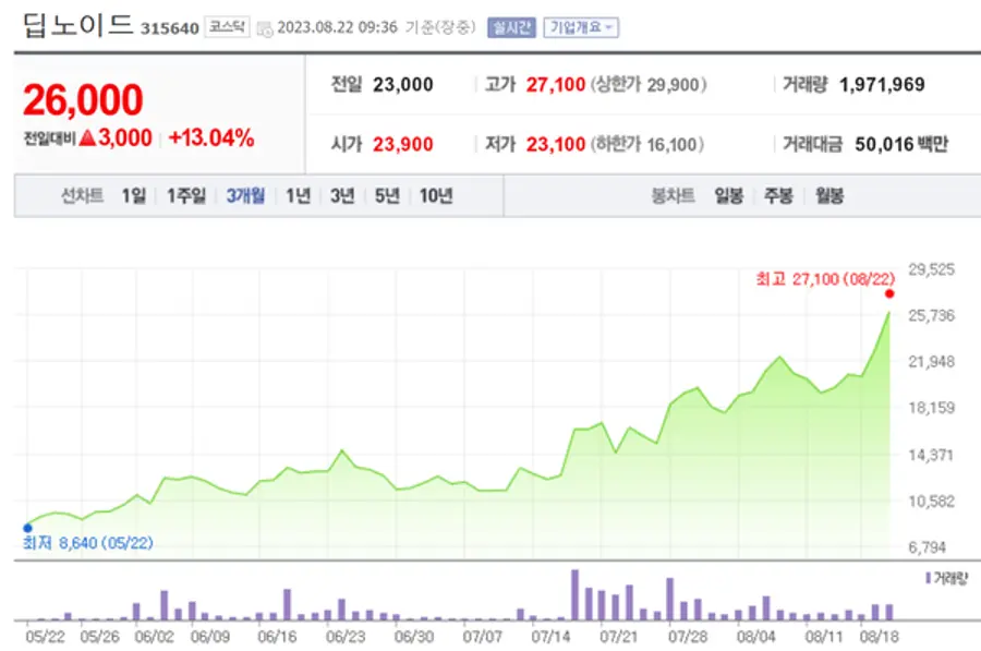 22일 오전 9시27분 현재 딥노이드는 전일보다 14.35% 상승한 2만6300원에 거래되고 있다. 이날 2만7100원까지 오르며 52주 신고가 행진을 이어가고 있다.
