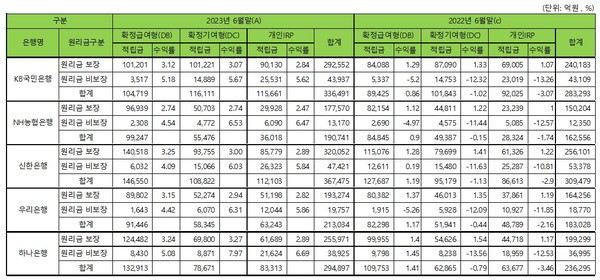 하나은행의 6월말 퇴직연금 운용 규모는 원리금보장형(25조5971억원)과 원리금비보장형(3조8925억원) 등 총 29조4897억원 규모이다. 1년전에 비해 5조8602억원(24.8%) 증가하고, 올들어서만 2조2259억원(8.2%) 늘었다.