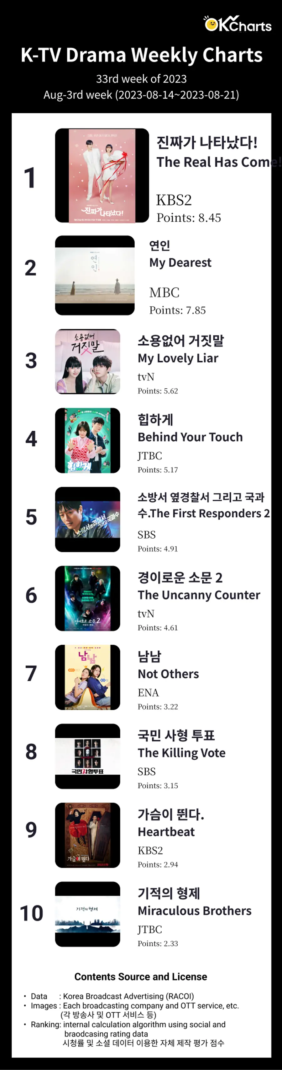 K-TV Drama Weekly Charts - 8월 3째주 (8/14 ~ 8/20) 1위: 진짜가 나타났다. 2위: 연인 3위: 소용없어 거짓말 #드라마#k드라마#진짜가나타났다#연인#소용없어거짓말#힙하게#소방서옆경찰서