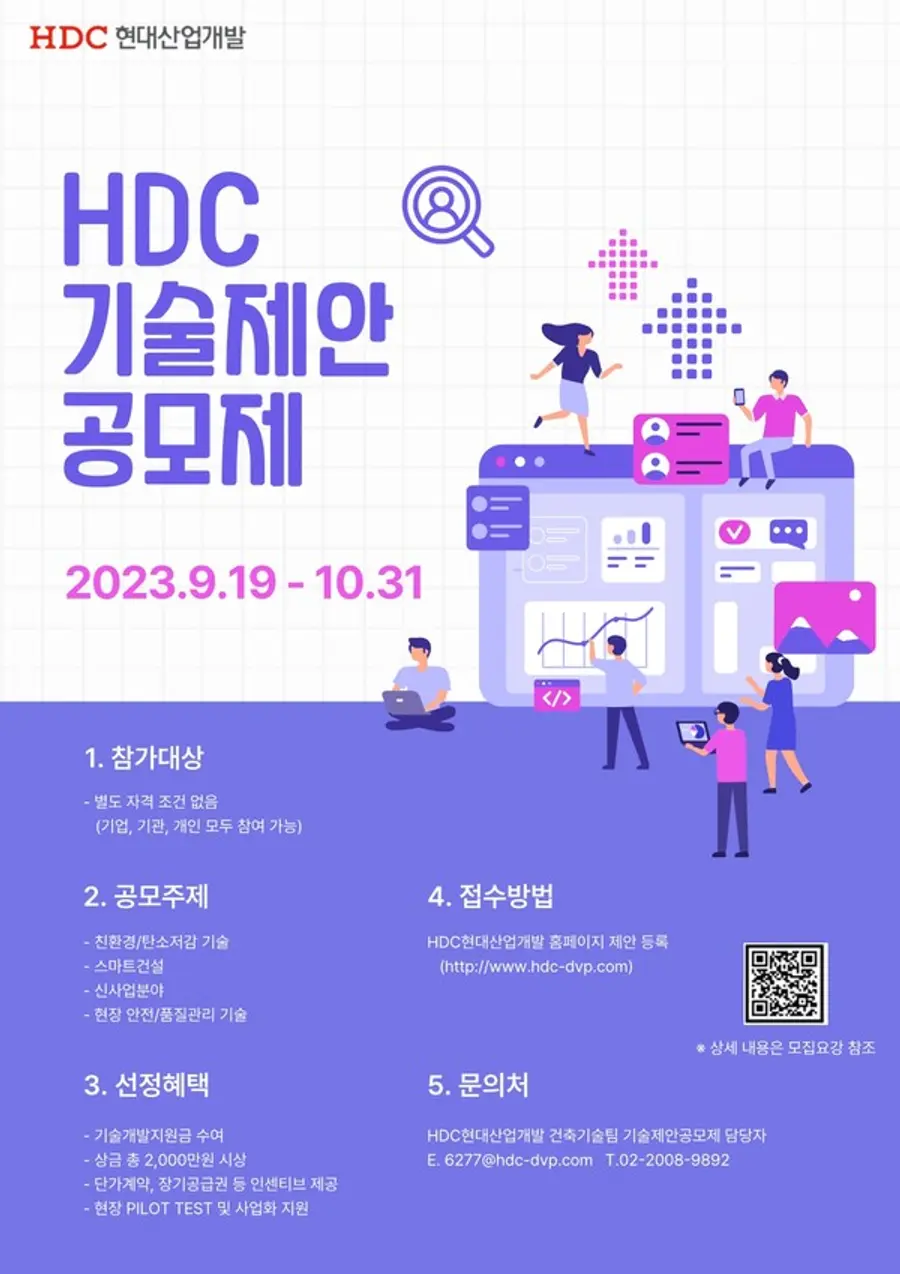 아이디어 접수는 9월 19일부터 10월 31일까지 HDC현대산업개발 공식 홈페이지에서 받는다. 11월 서류 심사와 12월 PT 심사를 거쳐 우수작에게는 총 2천만 원 규모의 기술개발지원금이 수여된다.