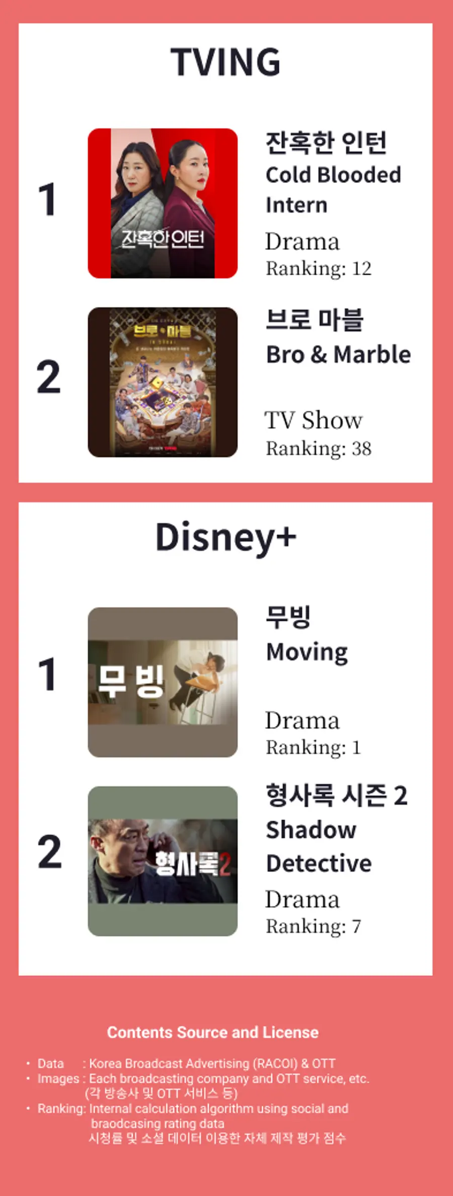 Disney+ 1위: 무빙 (자체랭킹 1위), 2위 형사록 시즌 2 (자체랭킹 7위)