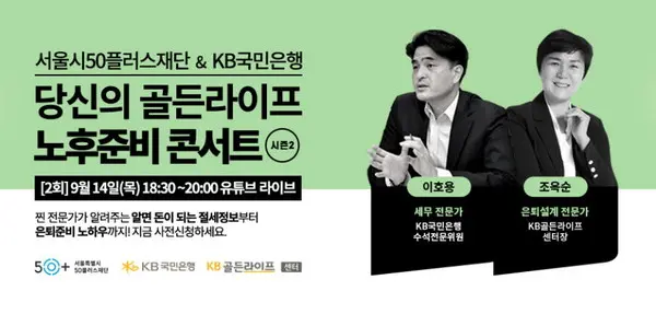 KB국민은행(은행장 이재근)은 오는 9월 14일 서울시50플러스재단과 공동주관하는 은퇴자산관리 세미나 ‘당신의 골든라이프, 노후준비 콘서트 시즌2’ 2회차 행사를 개최한다고 밝혔다.