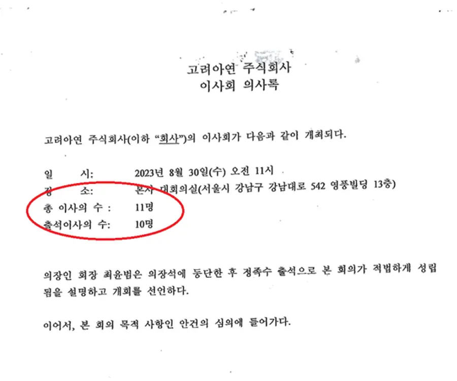 고려아연 등기이사 11명 가운데 10명이 참석, 출석 이사 전원의 찬성 속에 유상증자가 결의됐다.