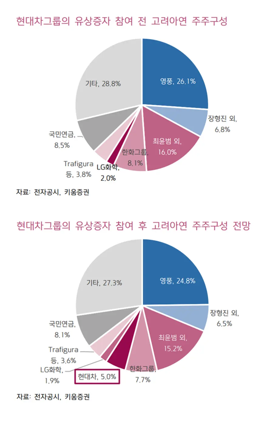 키움증권은 "아직까지 회사가 공식적으로 인정한 바는 없지만 작년 하반기 이후 고려아연 주주구성의 큰 변화를 두고 언론에서는 창업주 두 가문의 경영권 분쟁을 제기한 바 있다"며 "한동안 잠잠해졌던 경영권 분쟁이슈가 이번 유상증자이후 다시 부각될 가능성이 있다는 점에서 이번 유상증자를 주가측면에서 나쁘게 볼 필요는 없다"고 판단했다.