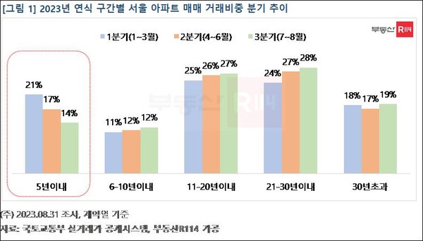 서울의 신축 아파트 거래 비중이 감소하는 분위기다. 부동산R114는국토교통부 실거래가 자료를 분석한 결과 3분기 들어 서울에서 입주 5년 이내 아파트 매매거래 비중이 14%(5562건 중 757건)에 그쳤다고 1일 밝혔다. 1분기 21%(6847건 중 1451건)대 7% 포인트 낮아졌다.