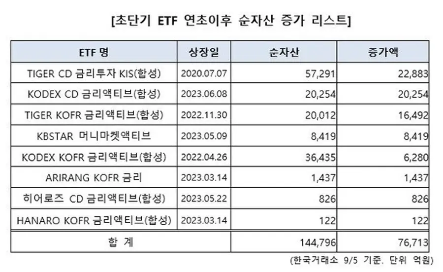CD금리 상품뿐 아니라 KOFR금리, 머니마켓 상품 등의 초단기 파킹형 상품 8종에 올해만 7.7조원 가량 몰리며 투자자들의 높은 관심을 받고 있다. 이에 따라 전체 ETF 시장의 올해 순자산 증가액 29.2조원 중 약 26.5%를 파킹형 상품이 차지했으며, 삼성자산운용도 ETF 순자산 증가액 10.4조원 중 약 25.4%인 2.65조원 가량이 이에 해당했다.