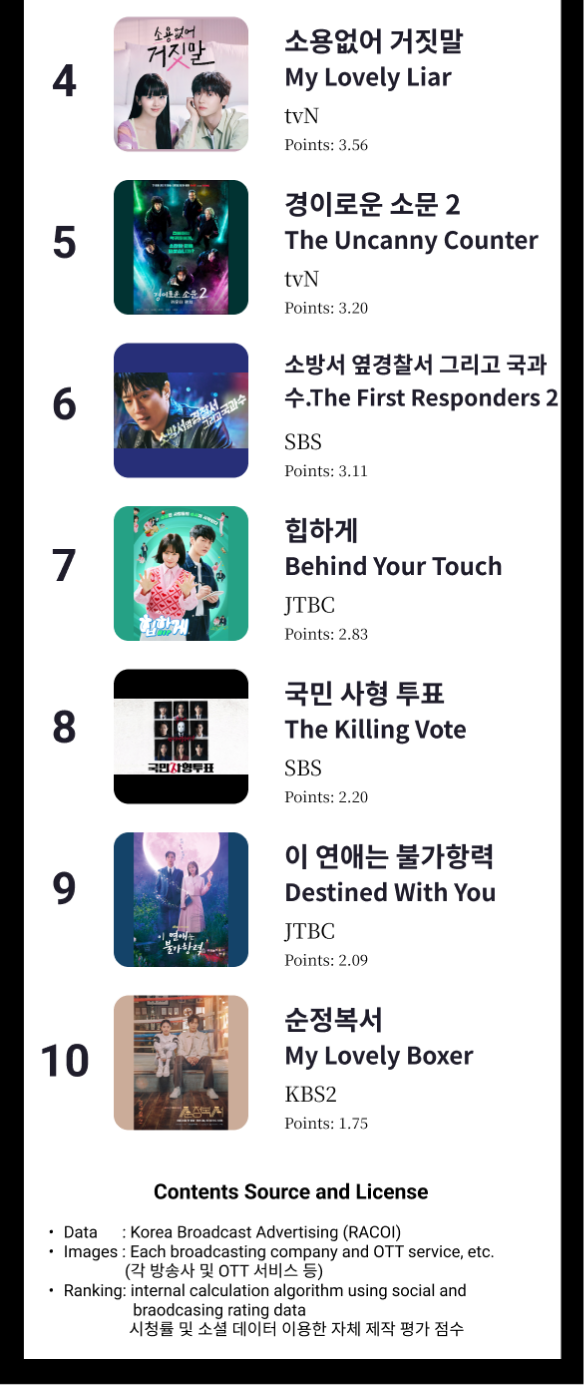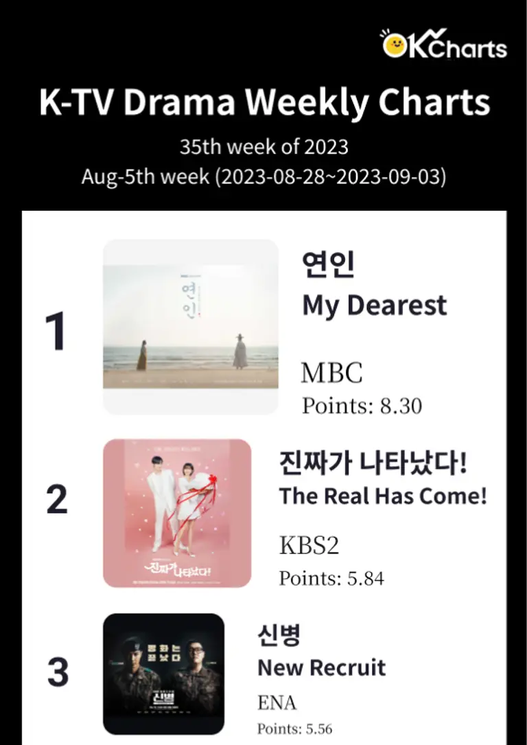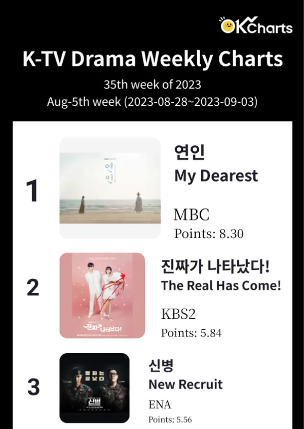 8월 5째주 TV 드라마 순위 차트입니다. 1위 연인 (8.30), 2위 진짜가 나타났다(5.84), 3위 신병2 (5.56)이 차지하였습니다. 신병2는 방영 첫주에 3위를 차지하였습니다.