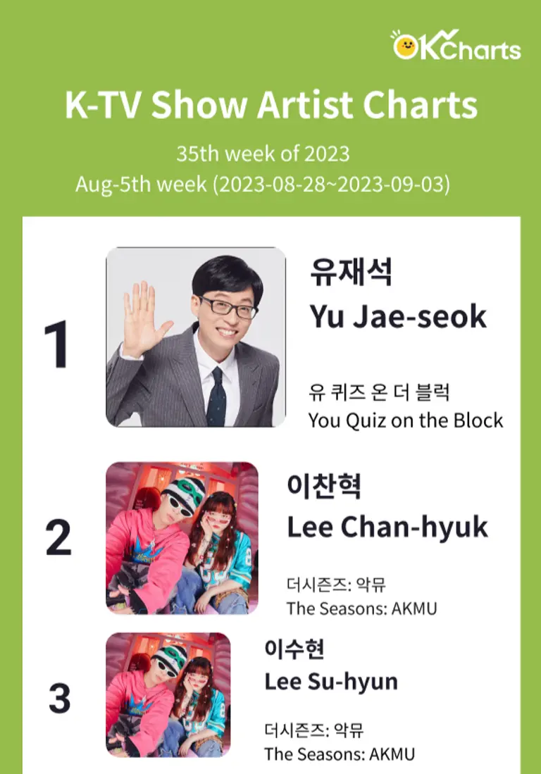 금주 TV 예능인 1위는 유 퀴즈 온더 블럭의 유재석 금주 TV 예능 차트입니다. 1위 유재석, 2위/3위는 더시즌즈:악뮤의 이찬혁님, 이수현님입니다. 악뮤의 발랄함으로 더시즌즈의 시청률이 개선 될 것으로 기대됩니다. #예능인#K예능인#K예능#유재석#악뮤#이찬혁#이수현#더시즌즈#김구라#원밀리언