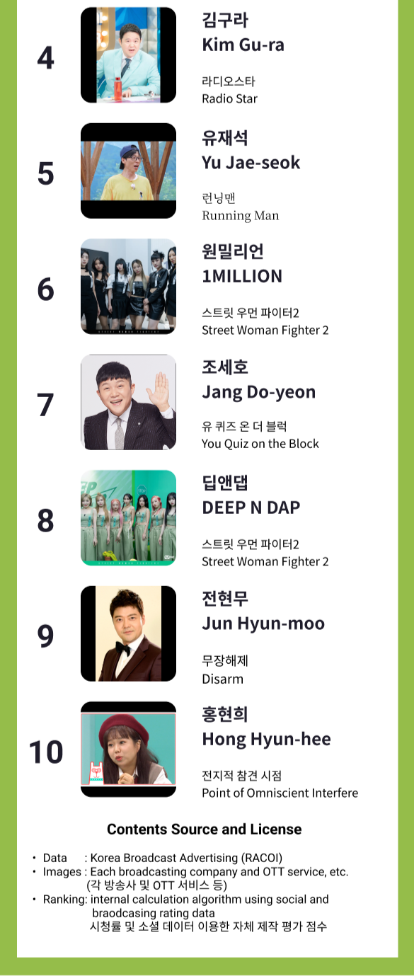 금주 TV 예능 차트입니다. 1위 유재석, 2위/3위는 더시즌즈:악뮤의 이찬혁님, 이수현님입니다. 악뮤의 발랄함으로 더시즌즈의 시청률이 개선 될 것으로 기대됩니다.