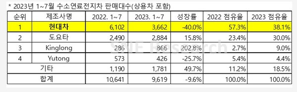 11일 SNE리서치에 따르면 현대차는 올해 7월말까지 넥쏘(NEXO)와 일렉시티(ELEC CITY)를 3662대 판매하며 시장점유율 38.1%로 전세계 수소차 시장 점유율 1위 자리를 유지했다. 넥쏘의 판매량 부진으로 현대차의 수소차 판매량은 전년대비 40% 역성장했다.