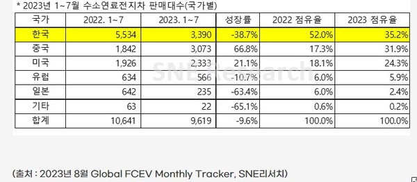 국가별로 살펴보면 우리나라는 현대차 넥쏘의 판매량 감소 여파로 전년 동기 대비 38.7% 감소했지만 35.2%의 시장 점유율로 수소차 시장 1위 자리를 지켰다. 중국은 수소 상용차를 중심으로 꾸준히 성장세를 이어가며 우리나라와 더불어 30% 이상의 시장 점유율을 기록했다. 미국은 최근 판매량 호조를 보이는 도요타 미라이가 가장 많이 팔리는 국가로 중국과 함께 성장세를 기록했다.