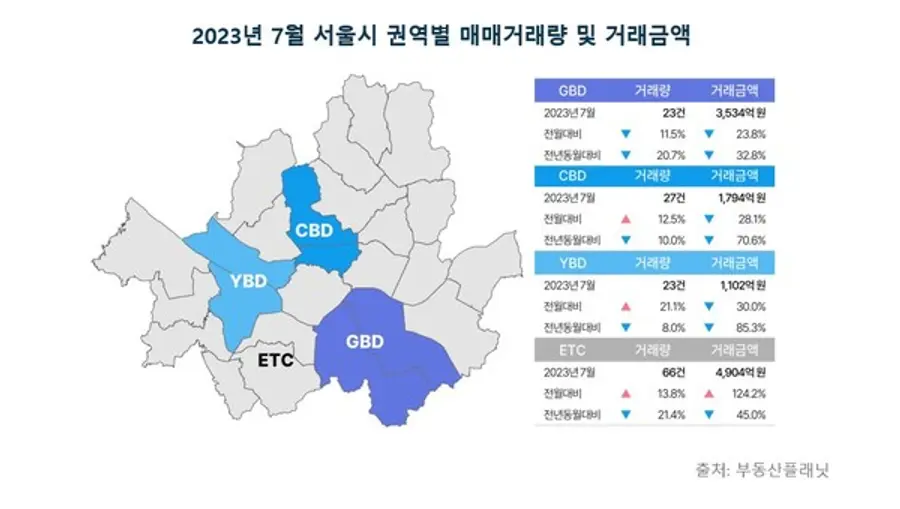 3대 권역의 거래금액은 6월 대비 모두 줄었다. YBD가 1102억원, CBD 1794억원, GBD는 3534억원으로 직전월과 비교해 각각 30%, 28.1%, 23.8%씩 하락했다. 그 외(ETC) 지역은 66건의 거래량과 4904억원의 거래금액을 띄며 13.8%, 124.2% 상승 마감했다.