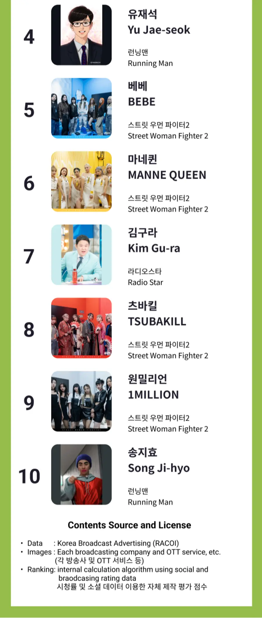 스트릿 우먼 파워2의 베베, 마네퀸, 츠바킬, 원밀리언이 Top 10을 차지하며 높은 인지도를 나타냈습니다.
