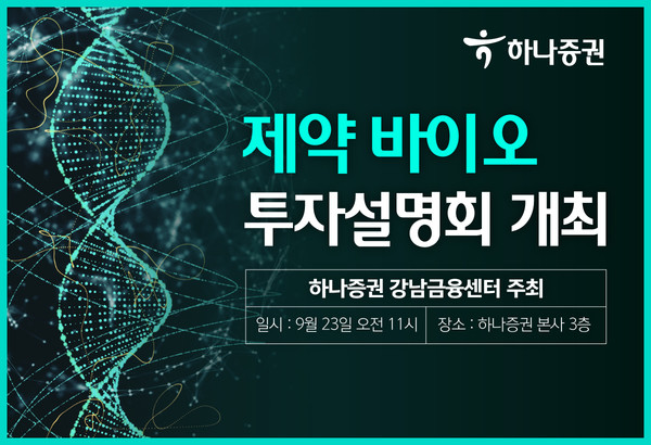 하나증권(대표이사 강성묵) 강남금융센터는 오는 23일 토요일 오전 11시부터 여의도 본사 3층 한마음홀에서 제약 바이오 업종 투자설명회를 개최한다.