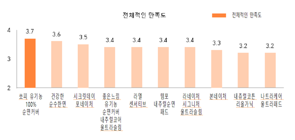 ‘건강한 순수한면’은 속옷에 생리대를 부착하는 부착 용이성과 떼어내는 제거 용이성이 모두 4.0점으로 가장 높았고, 전체적인 만족도는 ‘쏘피 유기농100% 순면커버'가 3.7점으로 가장 높았다.