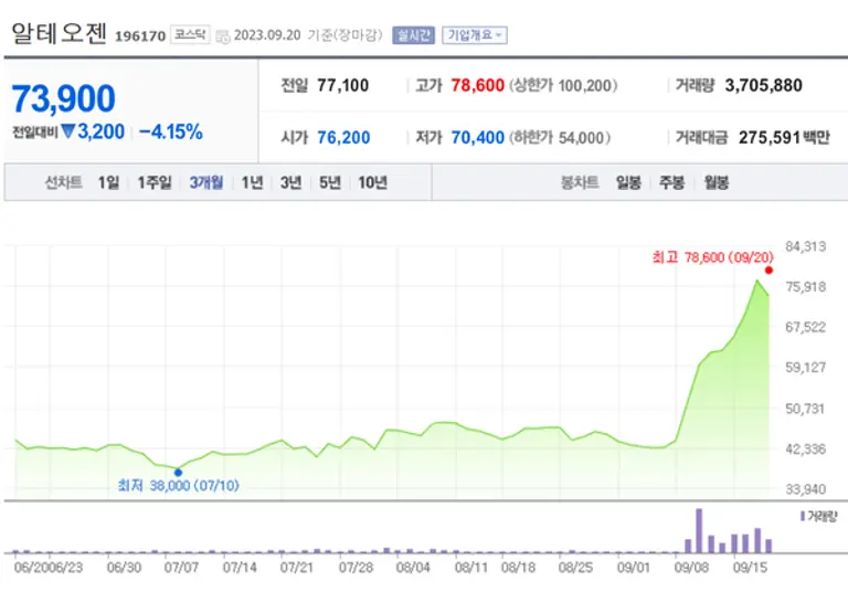 그의 확신에 찬 매수는 알테오젠의 과거 몸집도 큰 몫을 하고 있다. 알테오젠은 지난 2020년 9월 주가가 12만6790원까지 치솟았다.