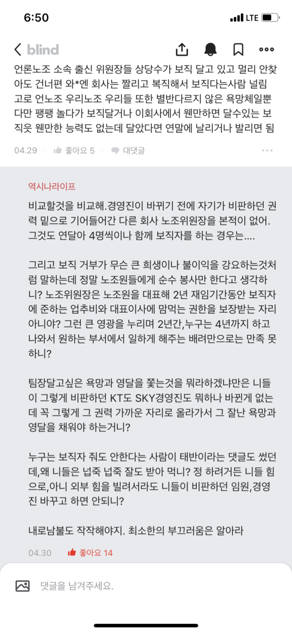 21일 직장인 익명 커뮤니티 블라인드에 "언론노조를 가장해 특권을 누리고, 회사 이익 카르텔을 공고히 하는 세력, 스카이라이프 언론노조 출신들의 전방위적인 이익 카르텔을 고발한다"는 제목의 글이 게시됐다. 케이티스카이라이프 전직 노조위원장들과 경영진의 유착을 비판하는 내용이다.