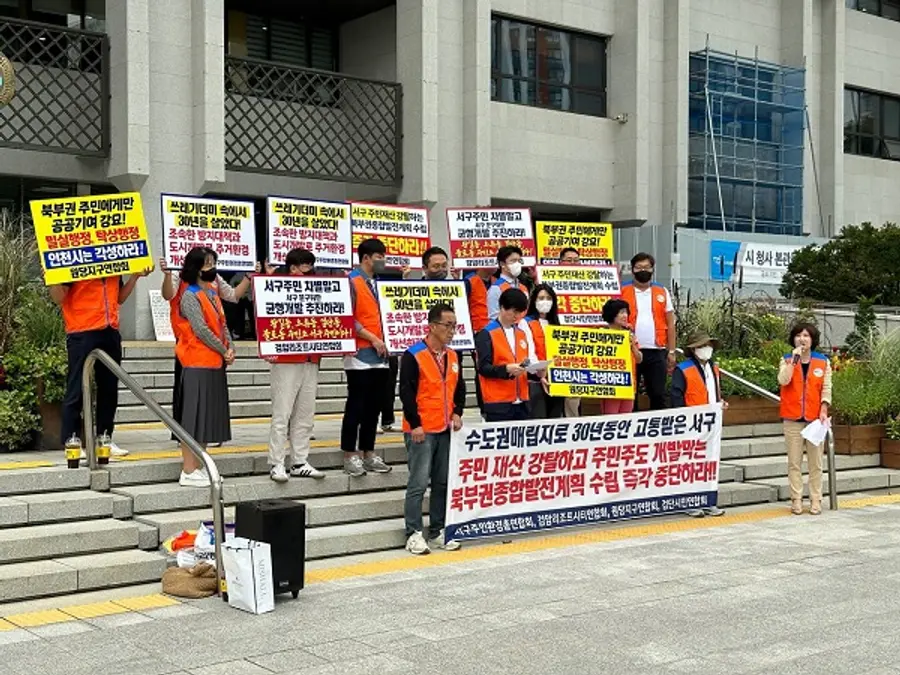 인천 서구 주민단체들로 구성된 검단시민연합(서구주민환경총연합회, 검암리조트시티연합회, 원당지구연합회)와 주민 등은 21일 오후 인천광역시청 정문 앞에서 기자회견을 열고 북부권종합발전계획 수립을 즉시 중단할 것을 인천시에 촉구했다.