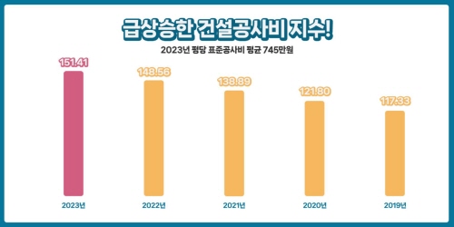 최근 아파트 자재비 및 인부 인건비 상승 여파로 분양 가격이 빠르게 상승하고 있다.국가통계포털의 최근 5년(2019년~2023년) ‘건설공사비지수’를 살펴보면 2019년 대비 약 29% 상승했다. 평당 표준공사비는 2023년 기준 평균 745만원을 기록했다.