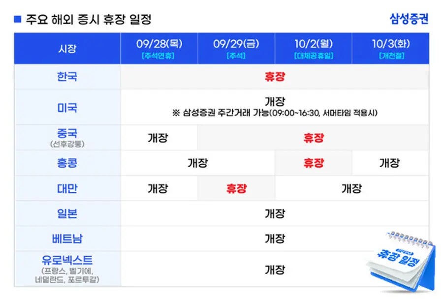 이번 추석에는 10월 2일이 대체공휴일로 지정됨에 따라 연휴 기간이 길어졌다. 이에 따라 휴장하는 국내 증시 대비 상대적으로 해외주식 시장에 대한 투자자들의 관심이 더 높아질 것으로 예상된다.