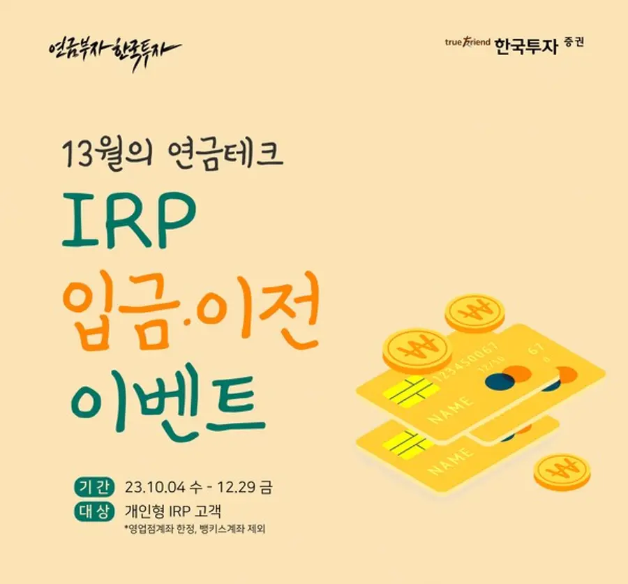 한국투자증권(사장 정일문)은 오는 12월29일까지 퇴직연금 IRP 입금 및 이전 이벤트를 진행한다고 4일 밝혔다.