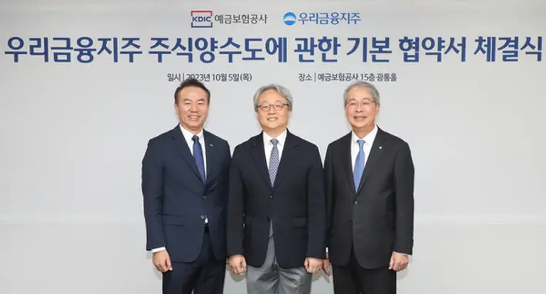 우리금융지주 주식양수도에 관한 협약서 체결식은 이날 오전 예금보험공사에서 임종룡 우리금융지주 회장과 유재훈 예금보험공사 사장이 참석한 가운데 열렸으며, 체결식에는 이인무 공적자금관리위원회 민간위원장이 임석했다.