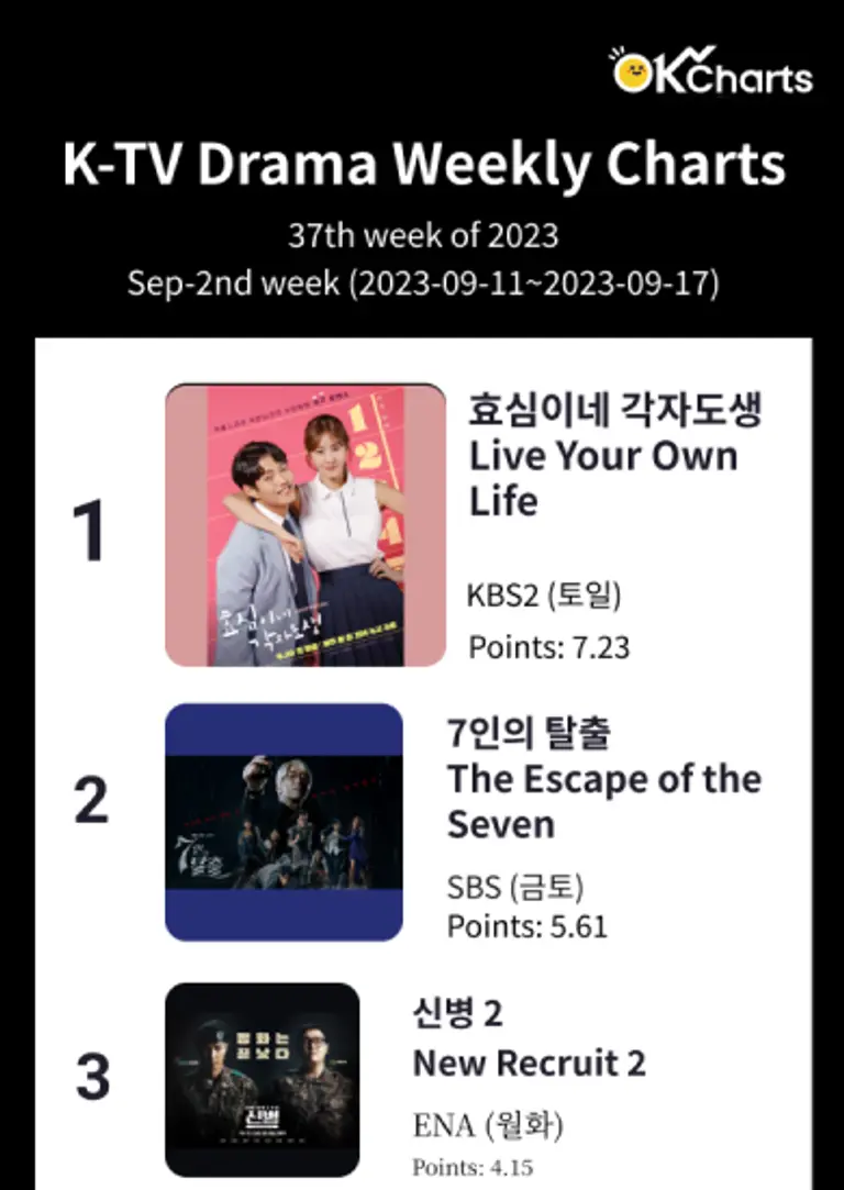 9월2째주 TV 드라마 순위 차트입니다. 1위 효심이네 각자도생 (7.23), 2위 7인의 탈출 (5.61), 3위 신병 2 입니다. 효심이네 각자도생이 방영 첫주에 1위를 차지하였습니다.