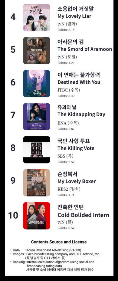 9월3째주 TV 드라마 순위 차트입니다. 1위 효심이네 각자도생 (8.84), 2위 7인의 탈출 (6.74), 3위 힙하게 2 입니다. 합하게가 종영에 맞추어 순위 상승이 있었습니다.